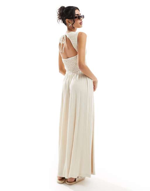 ASOS DESIGN crinkle shirred bodice maxi dress with open back in stone