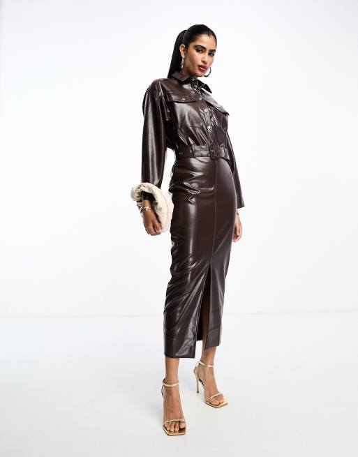 ASOS DESIGN croc leather look button down blouson midi shirt dress in brown