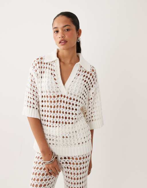 ASOS DESIGN crochet collared short sleeve top co-ord in cream