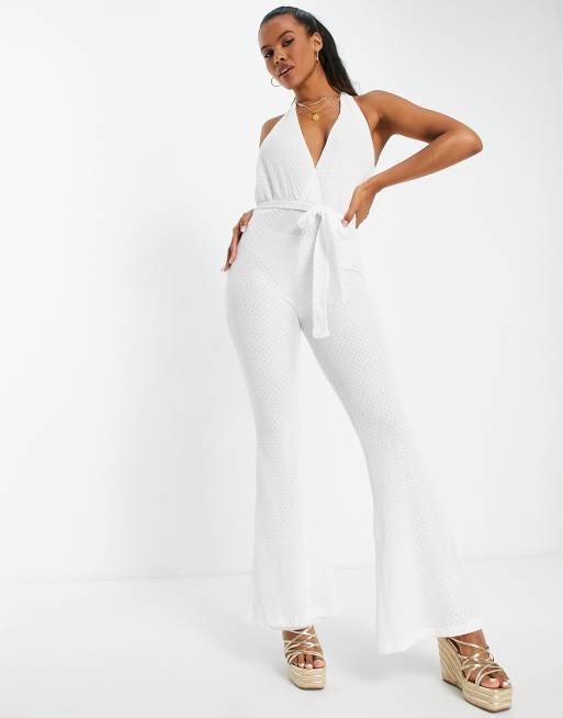 ASOS DESIGN crochet halter jumpsuit with flare leg in white
