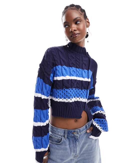 ASOS DESIGN crop jumper in mixed stitch with split details in blue stripe