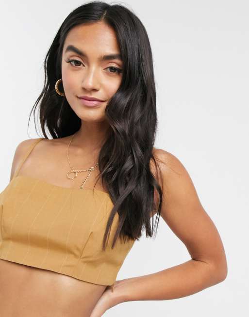 ASOS DESIGN cropped bandeau 3 piece suit in camel pinstripe