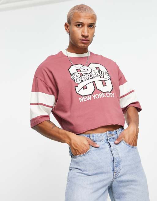 ASOS DESIGN cropped oversized t-shirt in burgundy colour block with New York city print