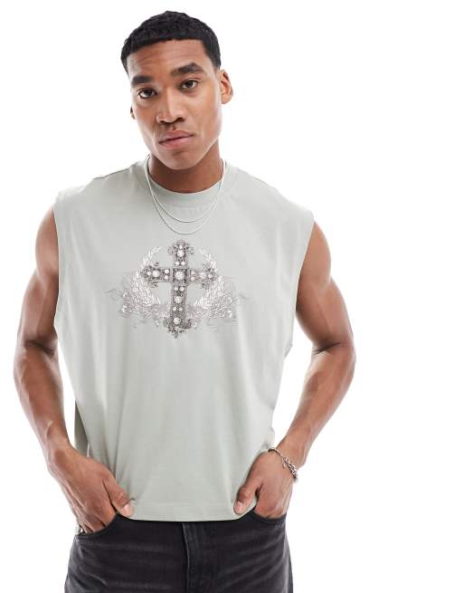 ASOS DESIGN cropped oversized vest in grey with cross front print