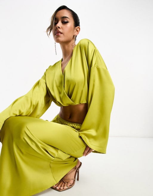 ASOS DESIGN cropped satin shirt & bias maxi skirt co-ord in chartreuse