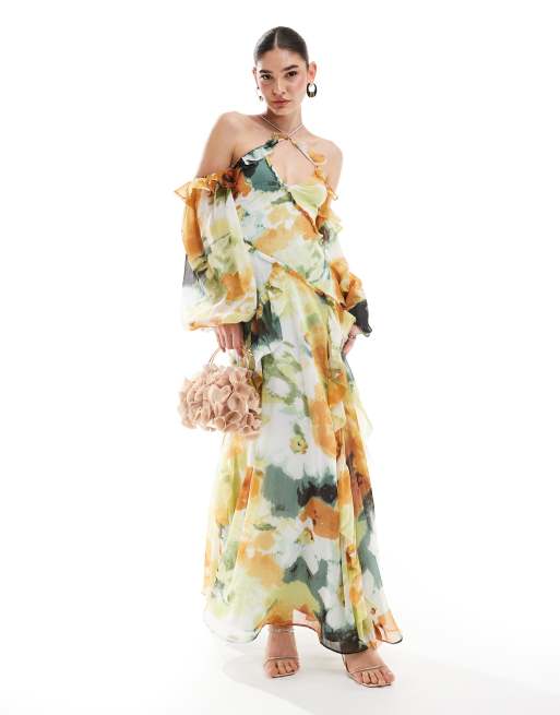 ASOS DESIGN cross neck cold shoulder maxi dress with ruffles in abstract floral print