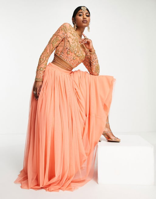 ASOS DESIGN crystal lehenga set in coral - CORAL