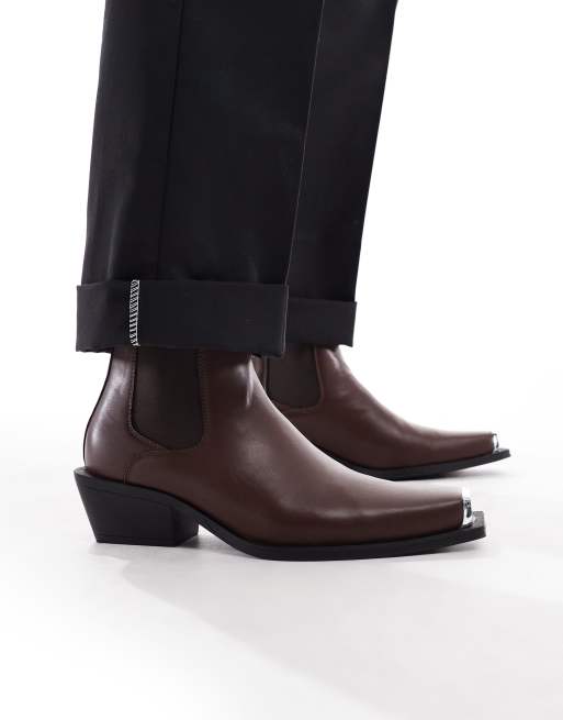 ASOS DESIGN cuban heel western chelsea boots in brown with silver toe cap