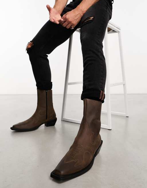 ASOS DESIGN cuban heeled chelsea boot in brown leather with square toe