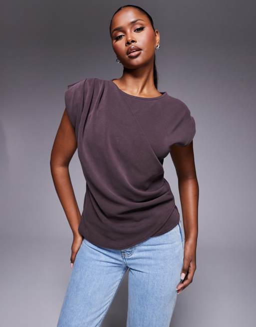 ASOS DESIGN cupro drape detail short sleeve t-shirt in brown