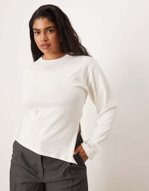 ASOS DESIGN Curve cinched waist asymmetric hem long sleeve tee in cream