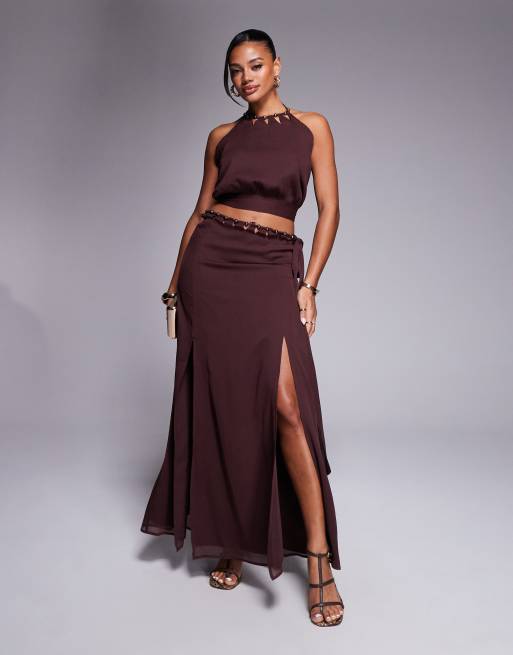 ASOS DESIGN cut out beaded volume maxi skirt co-ord in brown
