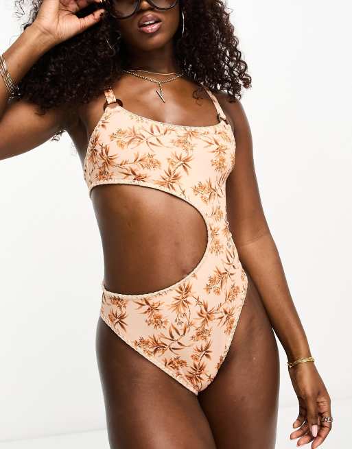 ASOS DESIGN cut out ring detail swimsuit with crochet detail in natural palm print