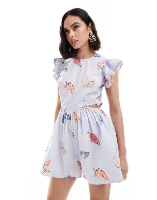 ASOS DESIGN cut out waist ruffle sleeve playsuit in blue shell print