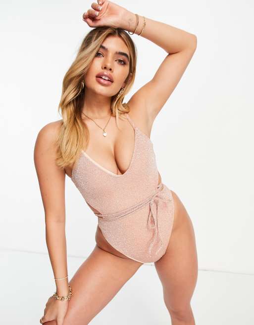 ASOS DESIGN cut out waist wrap lattice swimsuit in peach glitter