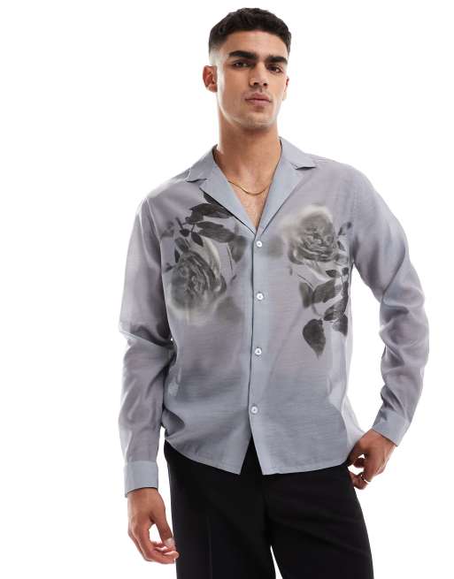 ASOS DESIGN deep revere shirt with floral placement print in grey - GREY