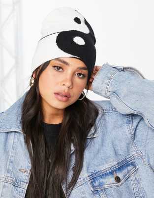 ASOS DESIGN deep turn up beanie hat with yin yang knit in mono