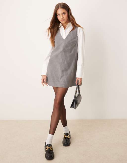 ASOS DESIGN deep v neck tailored shift dress in grey pinstripe
