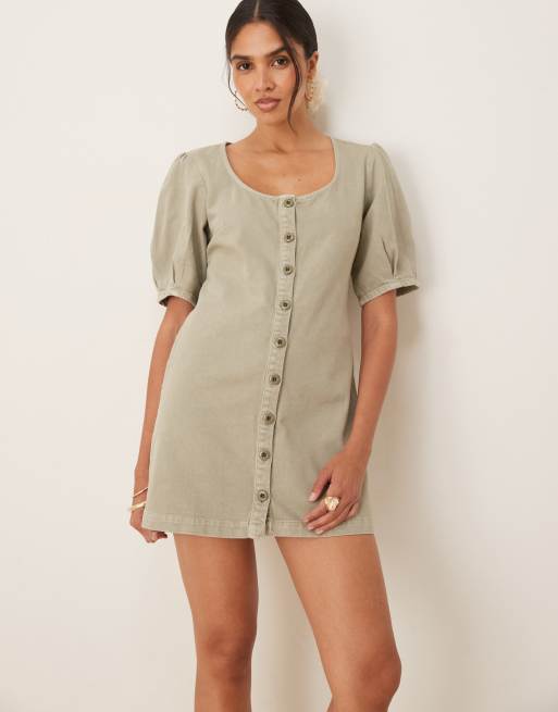 ASOS DESIGN denim button through mini dress with puff sleeves in khaki