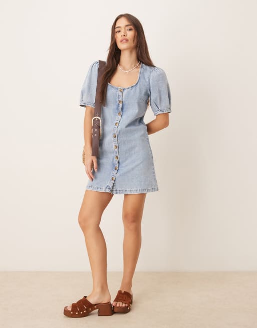 ASOS DESIGN denim button through mini dress with puff sleeves in pale wash