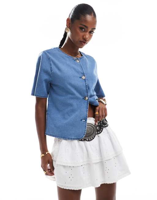 ASOS DESIGN denim button through short sleeve top in mid blue