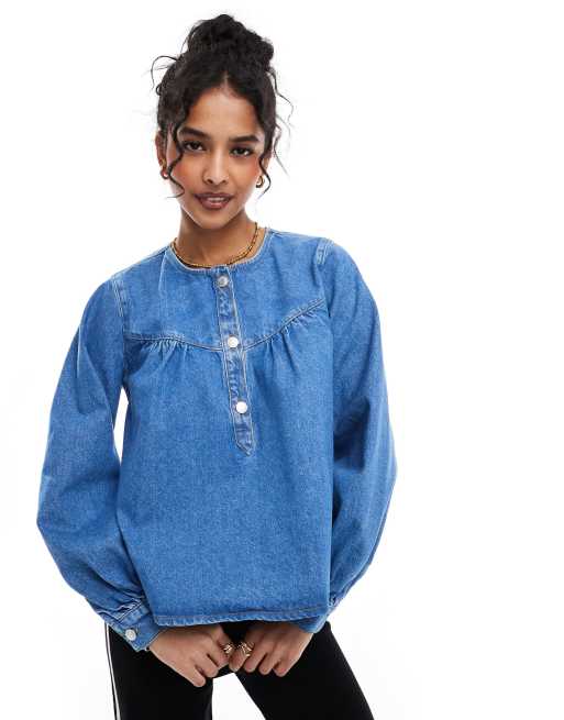 ASOS DESIGN denim collarless top in mid blue
