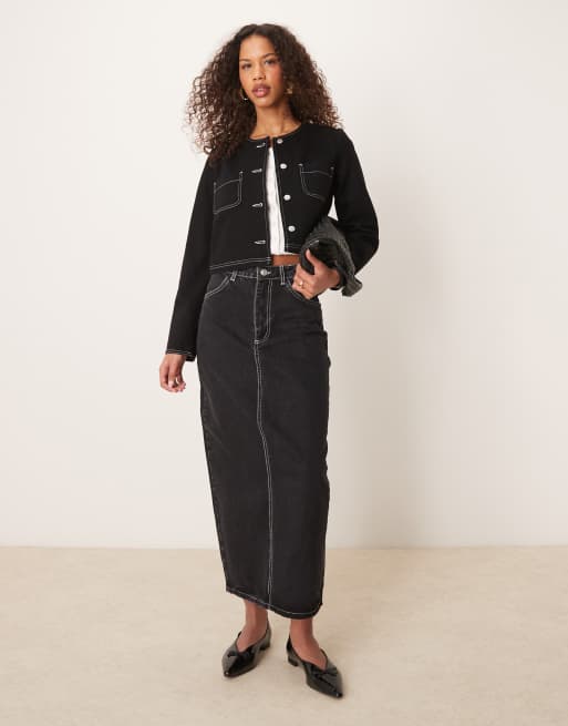 ASOS DESIGN denim maxi skirt with patch pockets contrast stitching in washed black