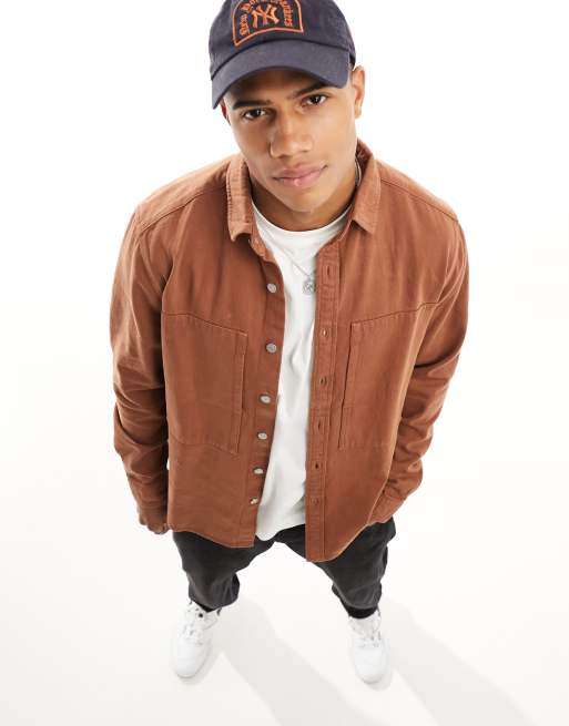 ASOS DESIGN denim overshirt with side oversized pockets and buttons in tan