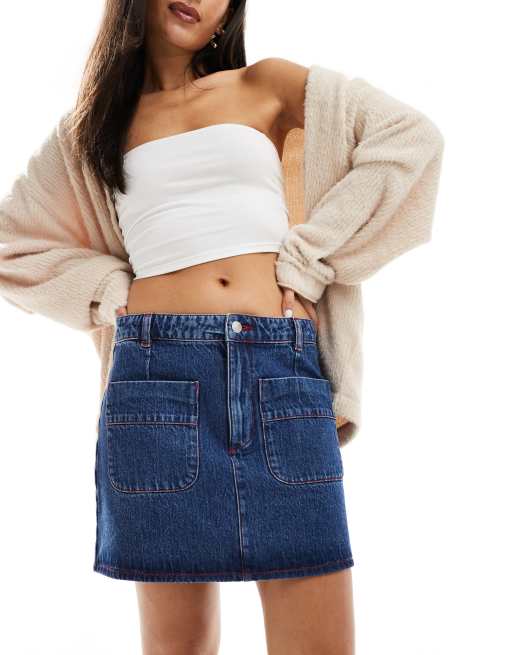 ASOS DESIGN denim patch pocket mini skirt in mid blue