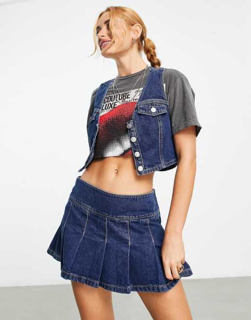 ASOS DESIGN denim pleated mini skirt co-ord in mid blue