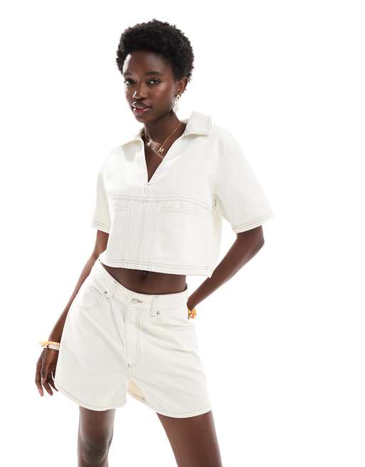 ASOS DESIGN denim rugby top in ecru co-ord