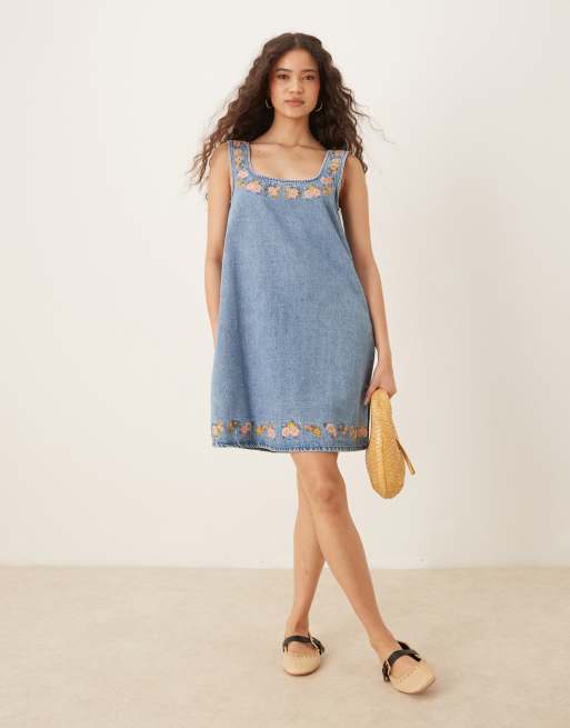 ASOS DESIGN denim square neck mini dress with embroidery in midwash blue