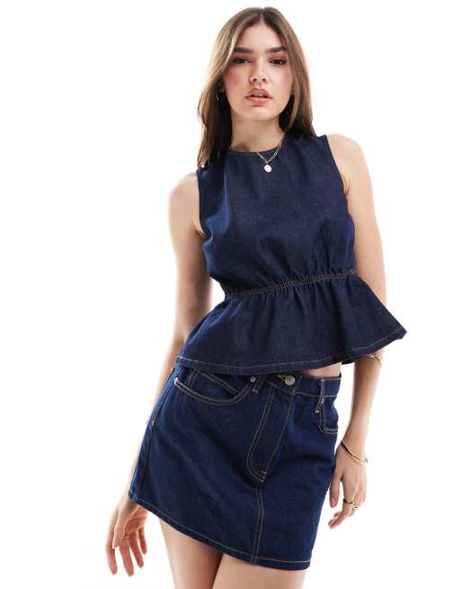 ASOS DESIGN denim tie back top in mid blue