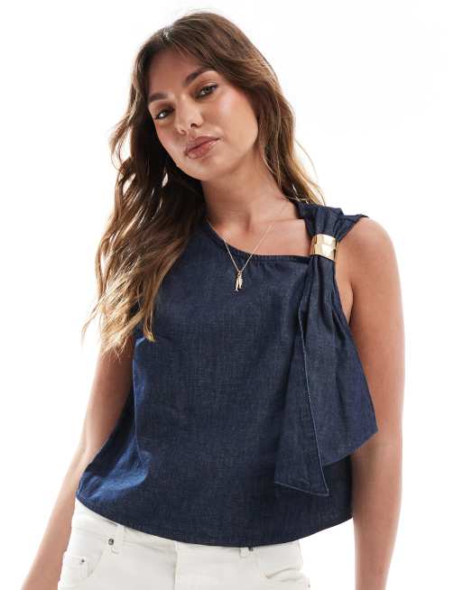 ASOS DESIGN denim top with asymmetric neck and gold hardware