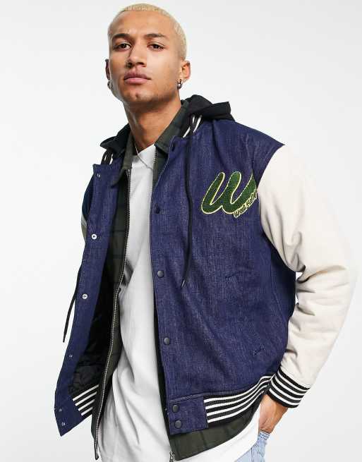 ASOS DESIGN denim varsity bomber jacket with hood in mid wash blue