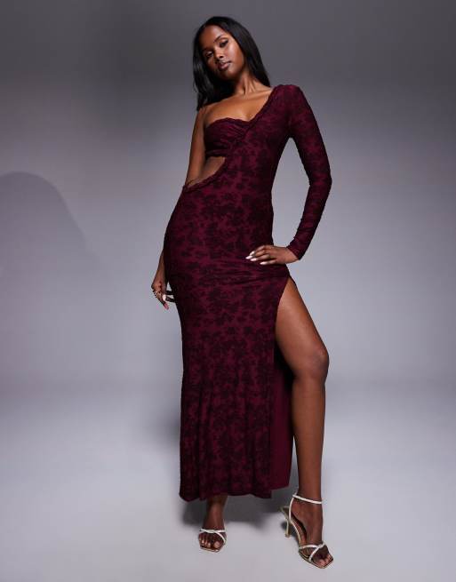 ASOS DESIGN devore cut out maxi dress with one sleeve and side split in burgundy