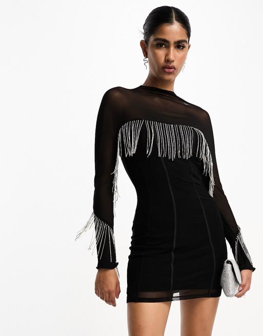 ASOS DESIGN diamante fringe mesh mini dress in black