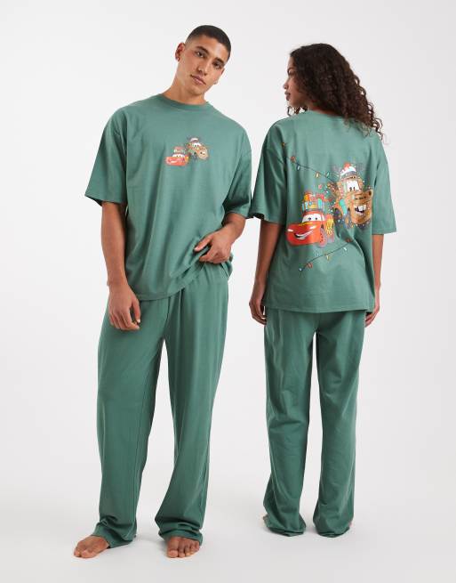 ASOS DESIGN Disney Pixar pyjama set with Christmas Cars graphic in dark green