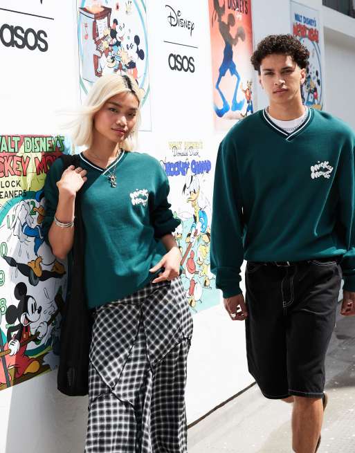 ASOS DESIGN Disney unisex boxy fit v neck sweatshirt with Mickey Mouse prints in green