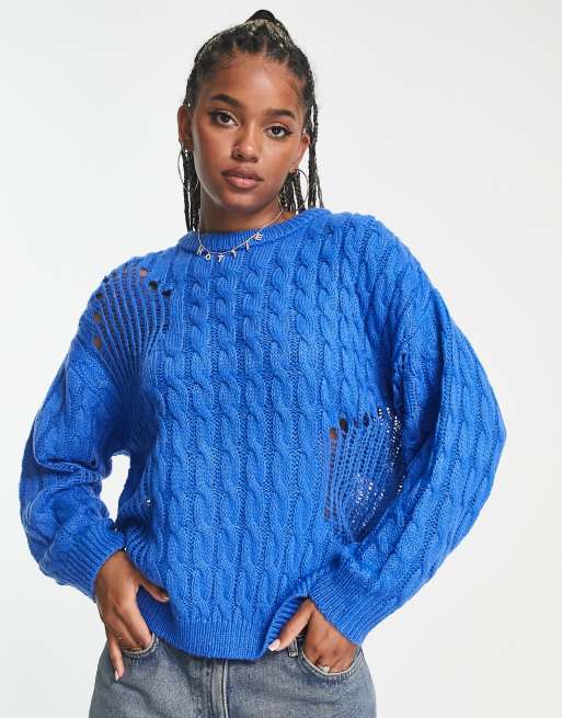 ASOS DESIGN distressed oversized jumper with open cable stitch in blue