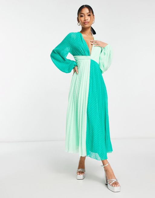ASOS DESIGN dobby twist front pleated midi dress in green colour block