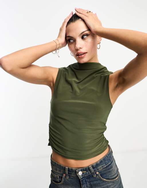 ASOS DESIGN double layer high neck tank top with ruched sides in khaki
