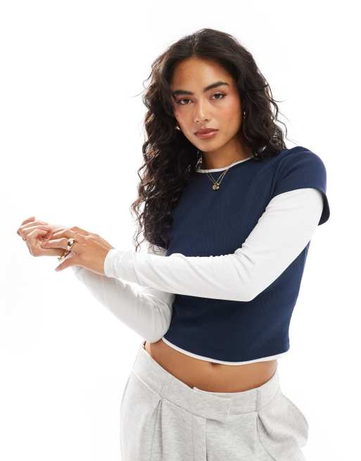 ASOS DESIGN double layer long sleeve baby tee in navy and white