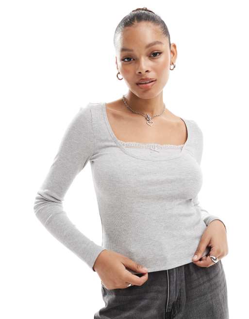 ASOS DESIGN double layer long sleeve with lace and bow detail in grey marl