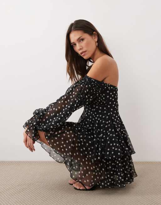 ASOS DESIGN double layer off shoulder godet mini dress in polka dot print