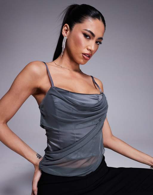 ASOS DESIGN draped mesh and satin mix cami top in charcoal