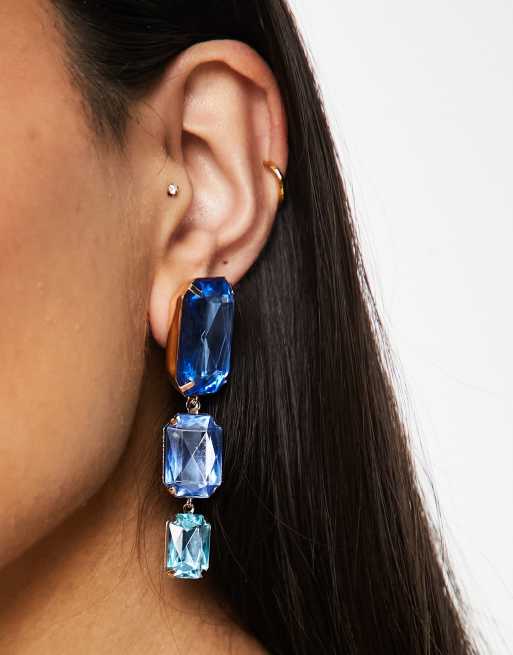 ASOS DESIGN drop earrings with tonal blue crystal drop in gold tone