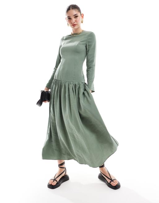 ASOS DESIGN dropped waist maxi dress with long sleeves in khaki