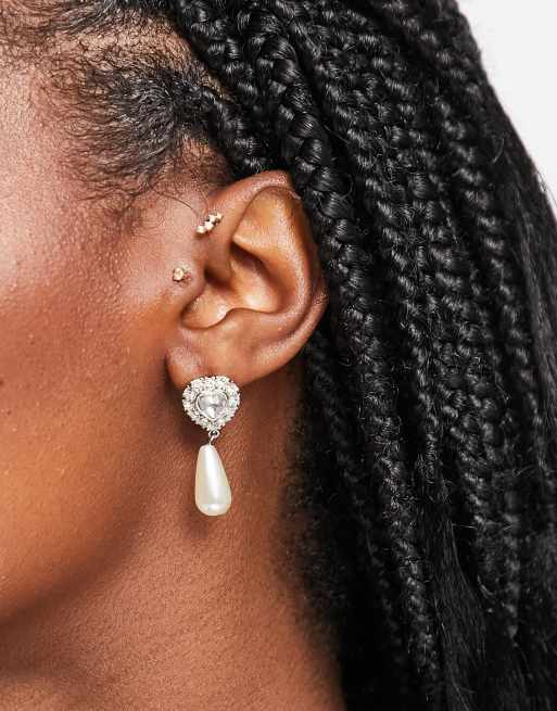 ASOS DESIGN earrings with crystal heart and faux pearl drop in silver tone