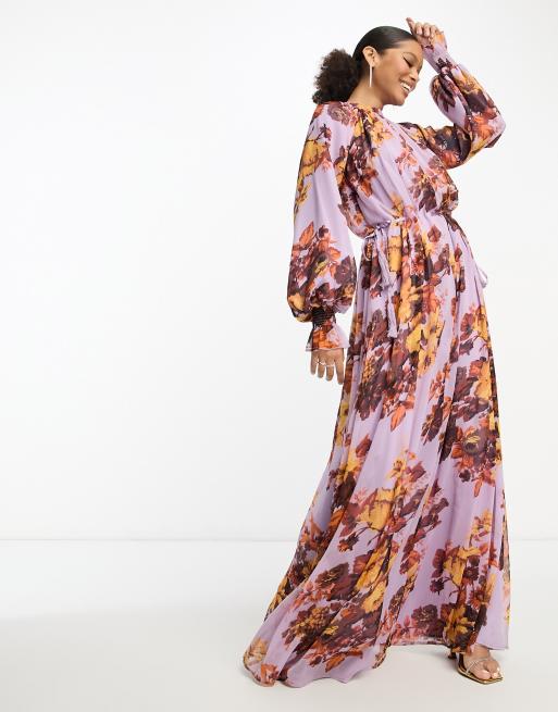 ASOS DESIGN elasticated neck trapeze maxi dress with tie waist and shirred cuff in bold floral print